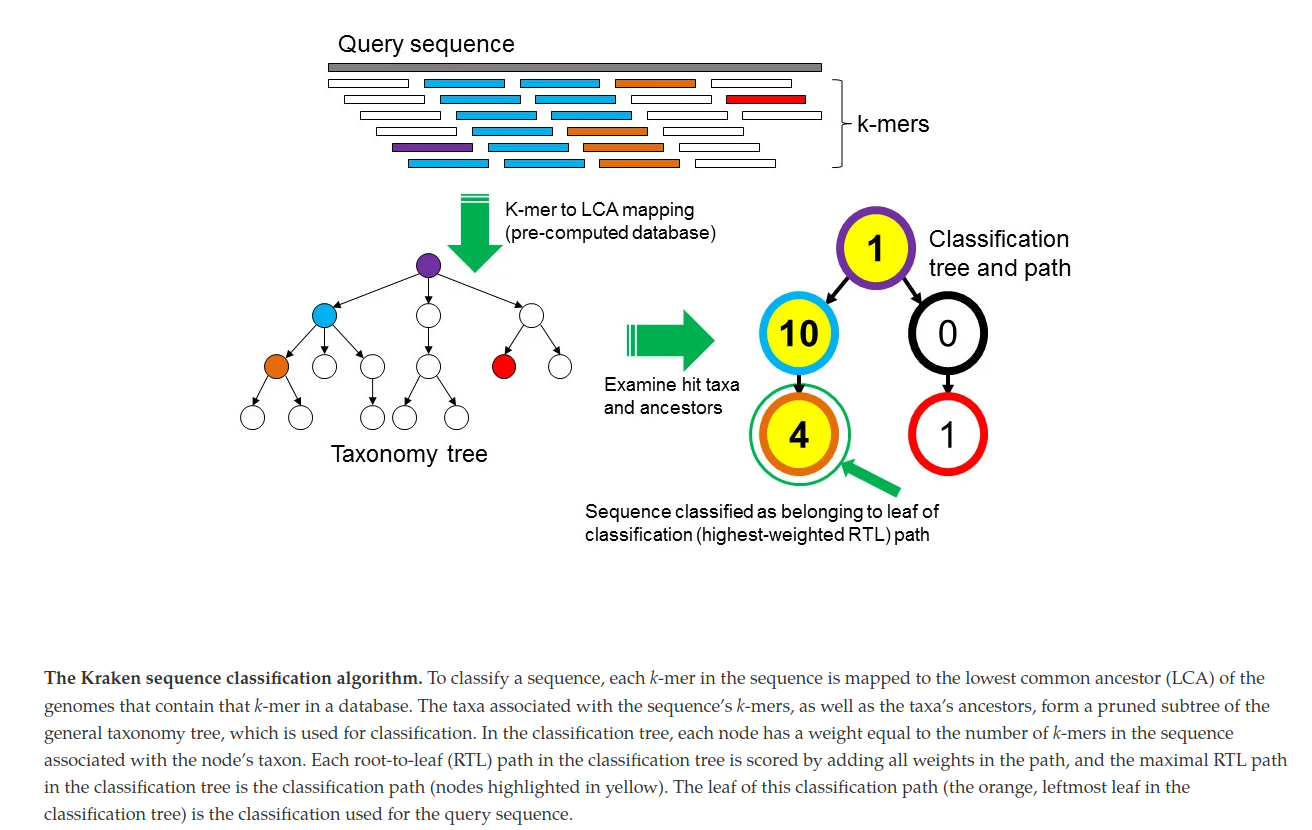 Kraken [5] is a very popular taxonomic affiliation tool. It is very fast and accurate. Kraken examines the k-mers (~35 bp) within the query sequence, searches for them in the database, looks for where these are placed within the taxonomy tree inside the database, makes the classification with the most probable position, then maps k-mers to the lowest common ancestor (LCA) of all genomes known to contain the given k-mer.
